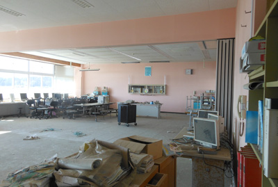 誰もいない街、フレコンパックの積み上がる庭先。山とパックの積み上げられた集積場。そしてパソコンも放送機材も泥にまみれて放置された小学校。がらんとした教室の跡に、子ども達の声はありません。聞こえるのは線量計の音だけでした。5年の月日を放射線が止めてしまった学校。あ らためて原発事故のような巨大広域災害の実態を見ることができました。