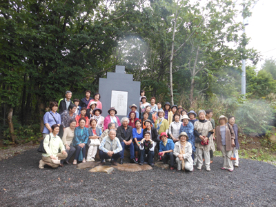 いよいよ野束の丘「三行の希い」の碑です。昨年の10月建立のご案内いただいていましたが、長野のツアーの後で休みが取れず残念な思いをしてました。1年後このツアーで、この美しい自然のなかでまさか「三行の希い」の碑の建立者・窪島誠一郎さんを迎えておたずねするとは、思ってもいませんでした。大変感激しました。完成するまでのご苦労などがたくさんあったことも、そして岩内の地に建ったことが、水上勉と窪島誠一郎ご両人にとって意義深いものであることを学ぶことができました。