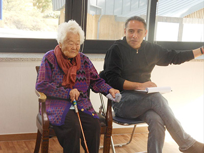 床暖があたたかいホールで待っていると髪を後ろでしばった男性に手を取られながらハルモニのイ・オクソンさんが来てくれました。体調がお悪いとか、お会いできないこともあると聞いていたのでお会いできて良かったです。