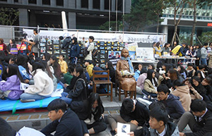 ついでに水曜集会では小学生が10人くらいで登壇していて、すこし太めの男の子がスピーチをしていました。日本の人は韓国の人たちが日本製品を買い控えしている事をどうせ韓国人はすぐに忘れると言ってるけれど、そんな事はありません。韓国人は忘れません。ごめんなさいと言う言葉を言うのは難しい事ではありません。そのごめんなさいをどうしていえないんですか!と言ってこみあげ周りの子達が支えていました。自分の言葉で述べる小学生、それを聞く若い人が多かった参加者、ソクラテスとかがギリシャの広場で意見を言い合う、民主主義の原点が日本大使館前ソウルにあると思いました。自由だな、いいなと…。