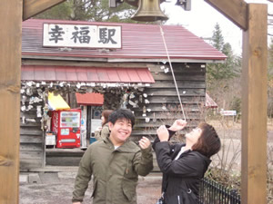 次に旧幸福駅を見学しました。鉄道は廃止されていますが、駅舎の中は願い事を書いた紙が沢山張られていました。幸福の鐘を鳴らし、家族の健康をお願いしてきました。