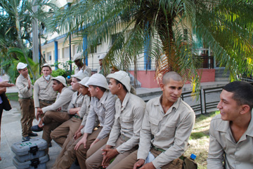 キューバには徴兵制があり17歳以上の青年は2年間の兵役義務があります。兵役を終えて大学や専門学校などに入学する青年もいます。ツアー一同が診療所訪問のとき玄関前に十数人の青年兵士が集まっていました。彼らはこれから各家庭に衛生のための援助(消毒などの手伝いでしょうか)に出かけるとのこと。これも軍隊の仕事だそうです。