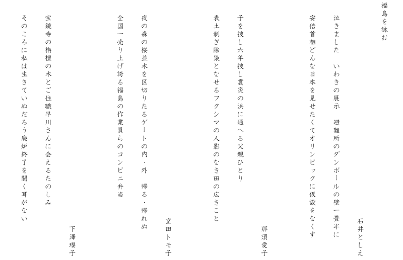 「歌群短歌会」の方が参加してくださり、歌を詠んで下さいました。石井としえさんは2012年から毎年、下澤瓔子さんもほとんど毎年参加して下さっています。 那須愛子さんが、報告もまとめて下さいましたのでご紹介します。