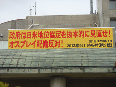 日本で唯一憲法9条を村政の柱にしている自治体。役場には「オスプレイ反対」の看板がでっかく掲げられていた。